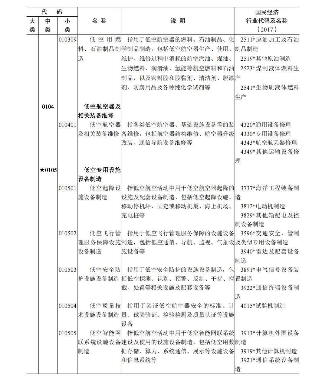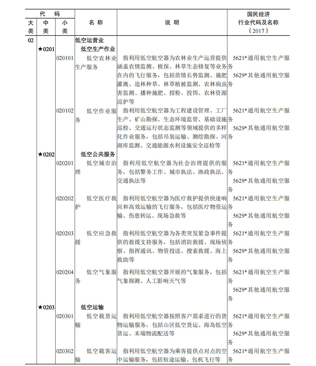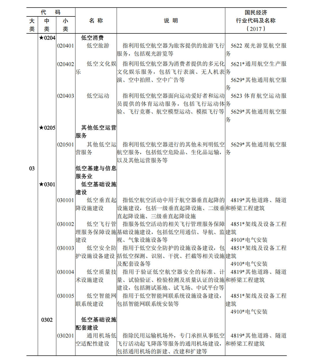 (一)本分类所涉及国民经济行业分类的具体范围和说明,与《2017 国民经济行业分类注释》相一致,并建立了对应关系。 (二)国民经济行业分类中仅部分活动属于低空经济及其核心产业的,行业代码用“* ”做标记。 (三)低空经济核心产业用“ ★”做标记。 (四)本分类在说明栏中,对具体行业内容进行了解释。 六、低空经济及其核心产业统计分类