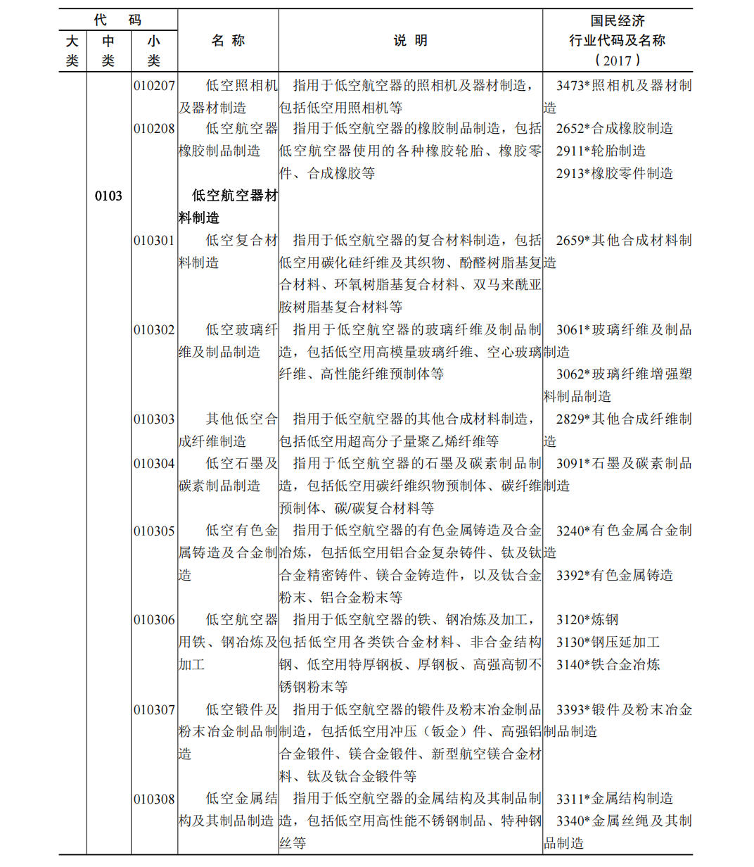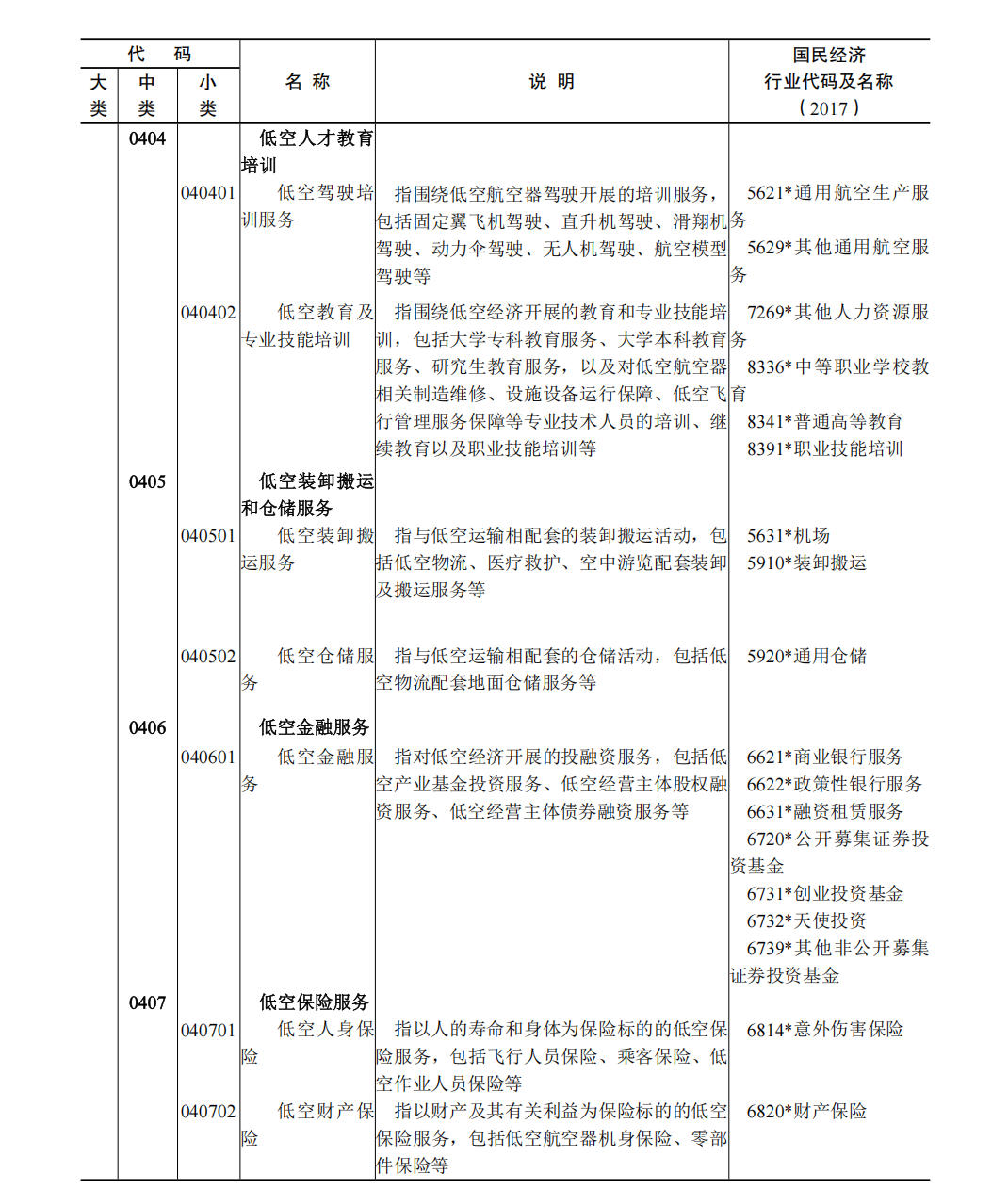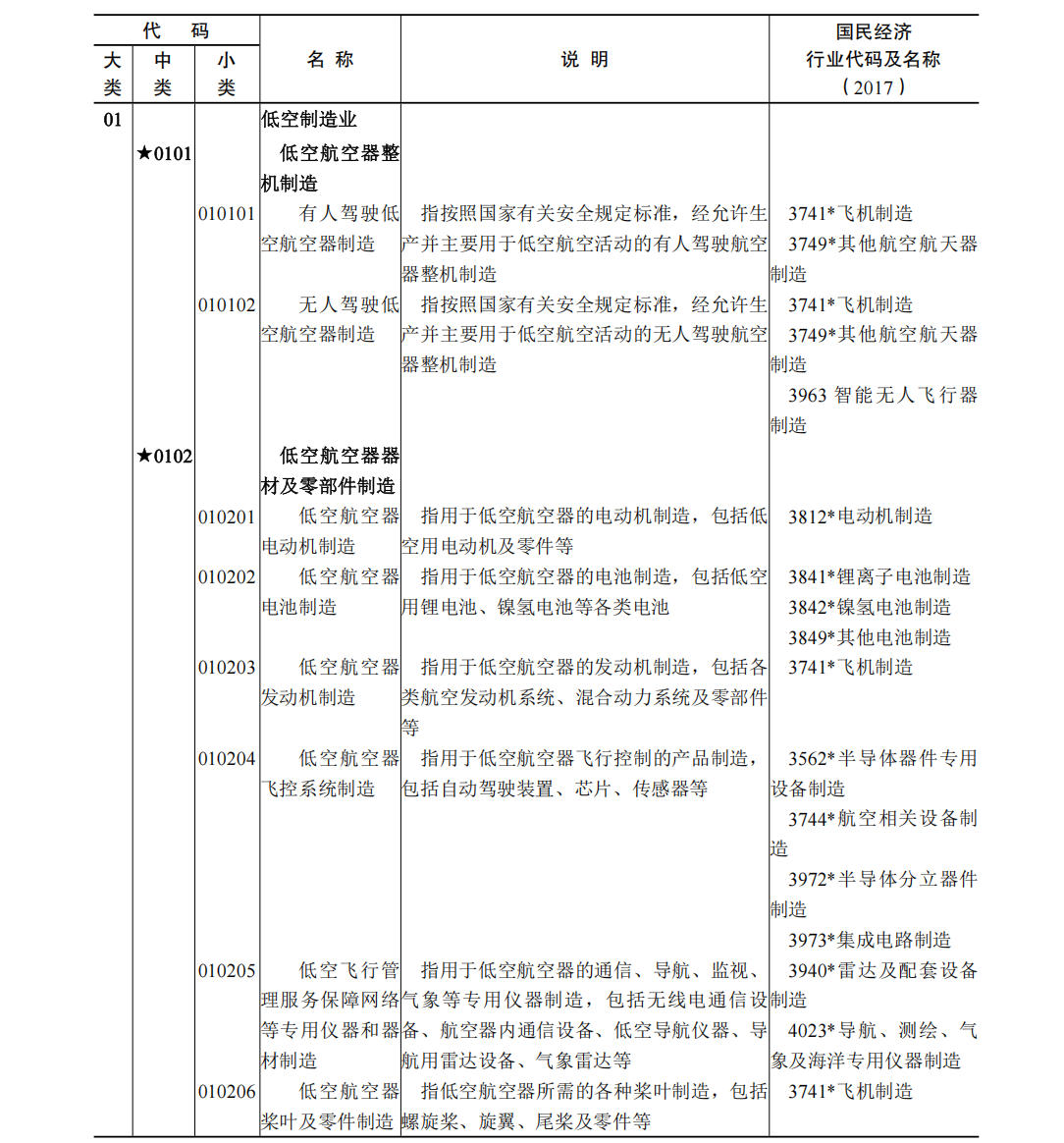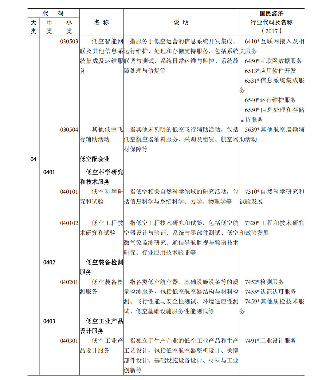 (一)本分类所涉及国民经济行业分类的具体范围和说明,与《2017 国民经济行业分类注释》相一致,并建立了对应关系。 (二)国民经济行业分类中仅部分活动属于低空经济及其核心产业的,行业代码用“* ”做标记。 (三)低空经济核心产业用“ ★”做标记。 (四)本分类在说明栏中,对具体行业内容进行了解释。 六、低空经济及其核心产业统计分类